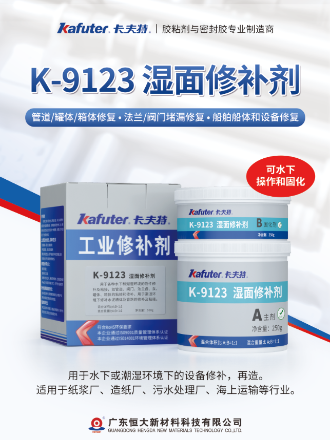 在暴雨倾盆的工厂车间、海水侵蚀的船舱管道,甚至是水下作业的关键设备中,设备渗漏与破损往往意味着高额停机损失和安全风险。传统修补方案在潮湿环境下的性能衰减、施工复杂等问题,卡夫特K-9123 湿面修补剂以它无需表面干燥,直面水汽甚至浸水工况的优点,为工业维修领域提供了更便捷地修补解决方案。