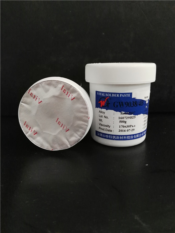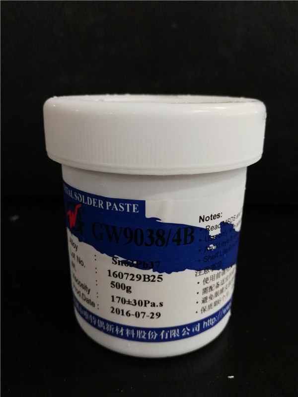 产品代码:G W9038/4B规格:SN63PB37产品特点1. 助焊剂体系选材科学,根据焊接机理而研制的,能有效降低焊料自由能和减少表面张力、提高融熔焊料的流动性和可焊性。2 具有优越的连续印刷性,特别适合细间距的印刷、脱网成模性好、粘着力强、不易坍塌。3 回流工艺窗口宽,在较宽的回流焊温区仍可达到优良的焊接效果。4 可焊性优越、焊点上锡饱满、光亮、透锡性强,焊接不良率低。5 焊后残留物很少、铺展均匀、不易吸潮、免清洗、具有优越的 ICT 测试性能、表面绝缘电阻高,电气性能可靠。适用范围:本产品可配合裸铜板、 镀金板、 喷锡板等表面处理的 PCB 板和其它各种有铅焊料合金元器件,在电脑主板、手机、MP3、MP4、通讯设备、音影设备、制冷设备、车载设备、仪器仪表、医疗设备和其它高可靠性、高品质电子电器中广泛使用。